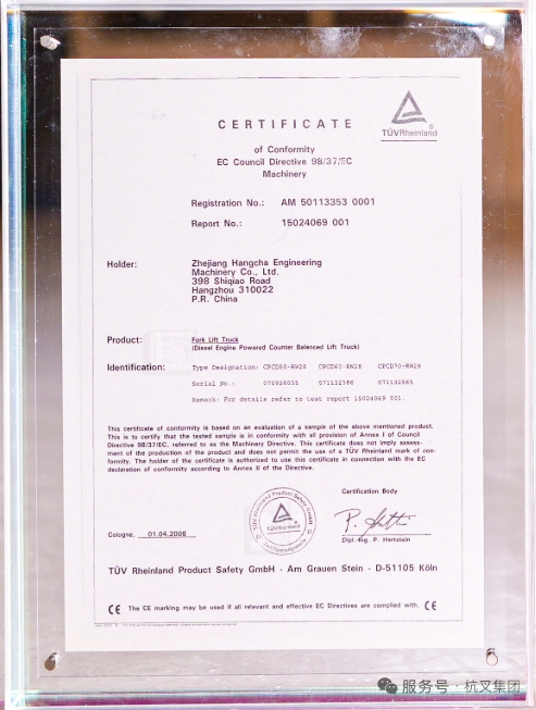 TÜV萊茵2008年為杭叉頒發(fā)首張叉車歐盟CE機(jī)械指令認(rèn)證證書